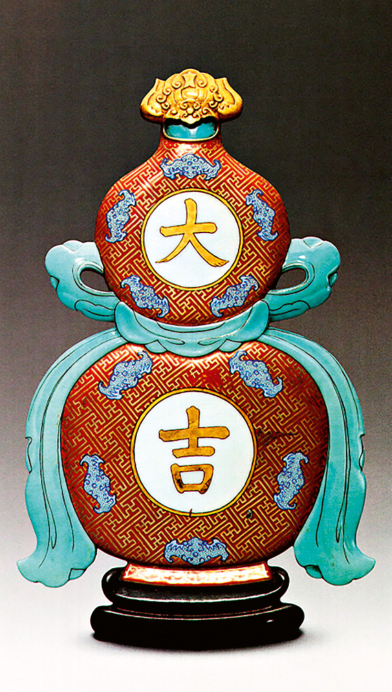 挂屏由硬木制外框与洋彩壁饰两部分组成,洋彩大吉壁饰葫芦型,顶饰金彩蝙蝠,腰缠松石绿彩锦带,底承以仿木釉如意足底座。挂屏主体以珊瑚红绘金彩“卍”字为地,上下开光以金彩书写“大”、“吉”二字,开光周围分绕蓝料彩五蝠。整器造型与纹饰共同组成“福禄绵长”、“子孙万代”、“大吉大利”等吉祥寓意,是重要的宫廷陈设品。 外框以木为胎,髹黑漆,描金彩绘为饰,边框饰缠枝花卉,框心绘缠枝葫芦,与瓷相配;背面绘山水人物图,细腻精致,是典型的宫廷绘画风格。 清宫档案内对大吉挂屏的烧造有明确记载,称之为“洋磁大吉葫芦挂屏”。《乾隆三十七年各作成活计清档》载:“着传伊龄阿照先烧造过磁大吉葫芦每年烧造几对随贡呈进,钦此。于本月十九日……将画得磁大吉葫芦纸样一张持进……呈览,奉旨准交江西照样烧造十对,得时在养心殿换安,钦此。”由此可知,若本品一类大吉挂屏应安放在养心殿。