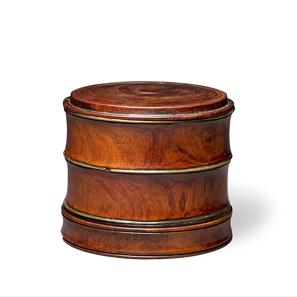 拍品以上好紫檀料制成,用料奢侈,设计巧妙,制作精细,由灯座、套盒、灯盏盖三部分组成。灯座底呈圆饼状,其上柱体有口,可方便拿取灯烛;套盒可扣合于柱体上,以固定灯烛;灯盏盖则而完全盖合灯座,盖外壁饰凸起弦纹,整体呈竹节状,简练大方。中国嘉德2016年春拍夜场曾释出一件清代黄花梨竹纹油灯盒,与拍品形制功能一致,可兹参阅。