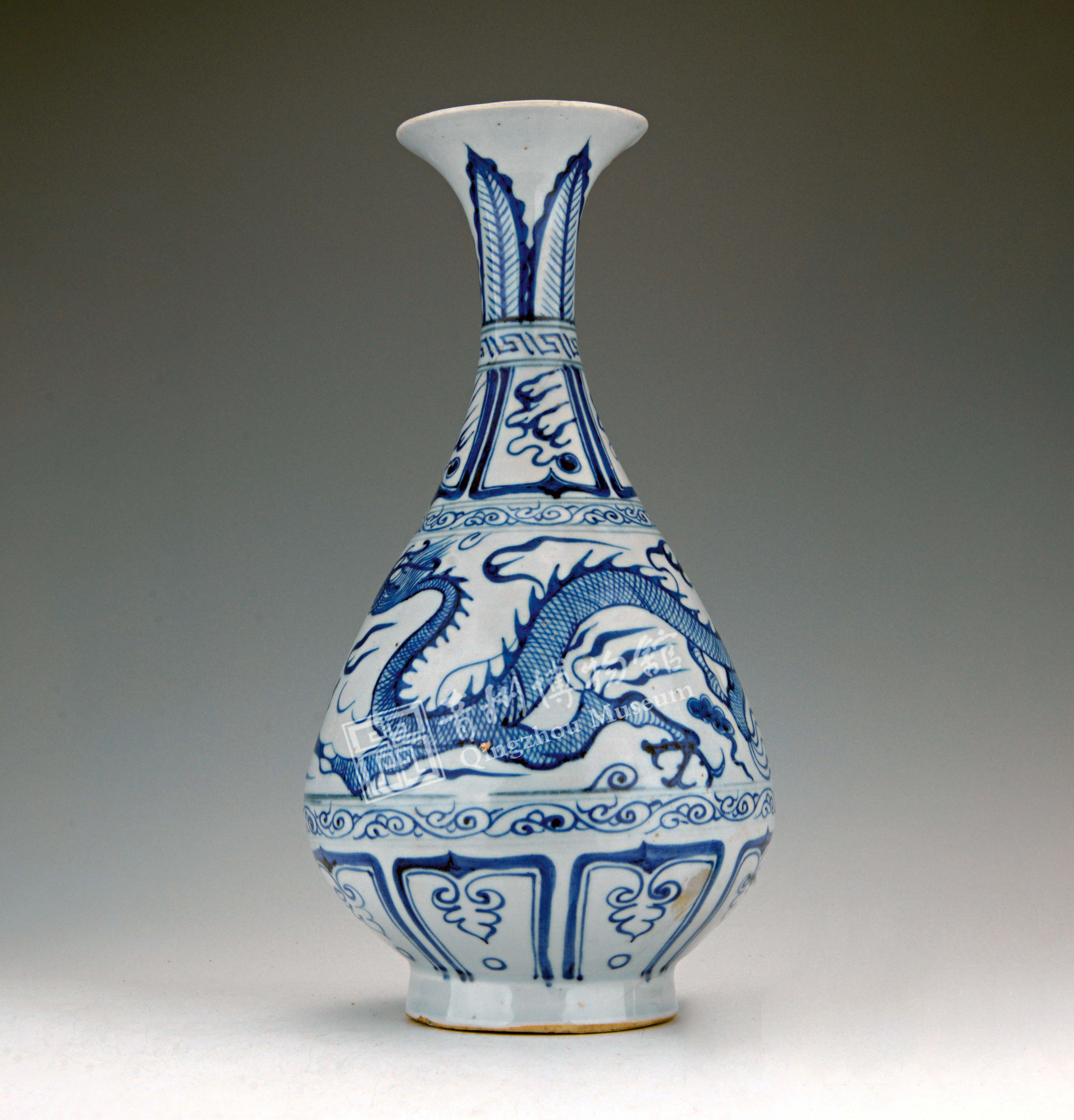 拍品造型及纹饰与青州市博物馆藏元青花云龙纹玉壶春瓶相同,为元代青花经典制器,挺秀俊拔。 拍品自口沿向下依次绘蕉叶纹、火珠纹、卷草纹、云龙纹及莲瓣纹,龙纹气势威猛,龙身伸展弯曲,极富张力,更有瑞光祥火缠绕四周,尽显飞龙在天的威猛气势。整器纹饰繁而不乱,绘工细致入微,笔触流畅灵动,青花发色浓淡有致,为元代青花典型装饰手法。 玉壶春瓶由宋人诗句中“玉壶先春”一词而得名,始见于宋代而一直延烧至今。许之衡《饮流斋说瓷》记:“玉壶春口颇侈,项短腹大,足稍肥,亦雅制也”,元代景德镇窑生产的玉壶春瓶形制,相较于明清样式瓶颈细长,腹部略收,修长俊拔,胎体相较其他陈设立件往往略显薄轻。