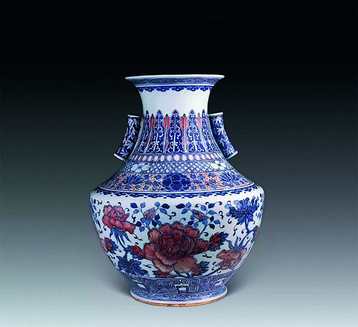 拍品形制硕大,颈两侧随器形饰竹节状贯耳,肩腹相交处有明显折棱,造型敦雅。口沿饰回纹,下饰如意云头纹与璎珞纹,颈部由上而下依次饰蕉叶纹、几何纹、锦地花卉纹及如意云头纹,贯耳满饰叶片,胫部饰两周回纹,足墙饰卷草纹。腹部主题纹饰为盛开的牡丹花,花朵硕大,勾绘精细,枝缠蔓绕,寓意“富贵万代”。整器端庄周正,纹饰繁缛,釉里红发色浓艳,青花发色明快,观之赏心悦目。