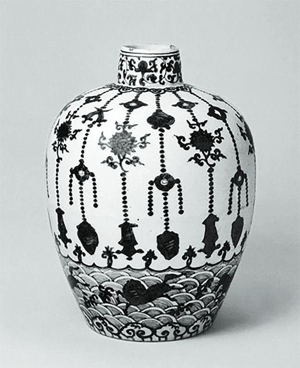 拍品造型、纹饰与故宫博物院藏明嘉靖青花璎珞海马纹罐相同,可兹参阅。 此罐造型独特,其器形为嘉万时期所特有,因上部与同时期梅瓶相似,又称“梅瓶式罐”。器腹所绘璎珞纹为佛教尊像之饰,明代用于瓷器装饰始见于宣德青花,嘉万时期最为流行。整器造型规矩,描绘精到,以青花勾勒的海浪线条淋漓潇洒,呈水波漫卷之态,衬以造型诡谲的海兽,妙趣横生。