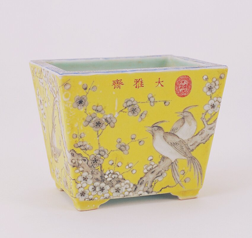 参阅图:清光绪 黄地墨彩花鸟纹长方小花盆,北京故宫博物院馆藏。